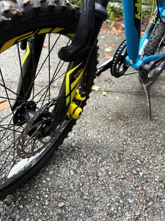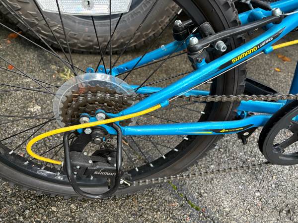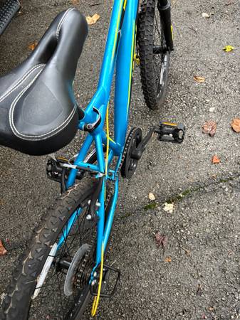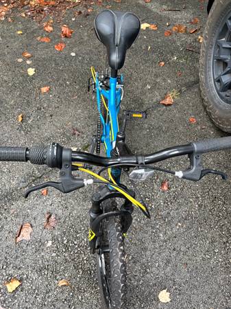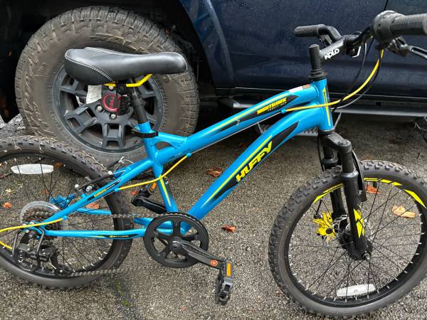 Huffy Nighthawk kid’s bike with 20” tires; used but works well with very little wear; 6 speed grip shifter; hand brakes front and back; disc brake (front); kickstand; leather seat; front fork shock...