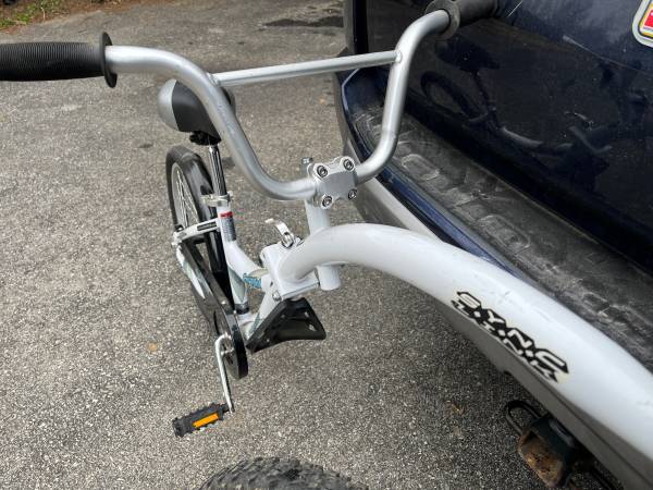 WeeRide CoPilot kid’s trailer bike with 20” tires; lightweight aluminum frame; used but works well with no repairs required; very little wear; includes all hardware to fasten to adult bike seat post; leather seat; foldable; quick release lever adjustment