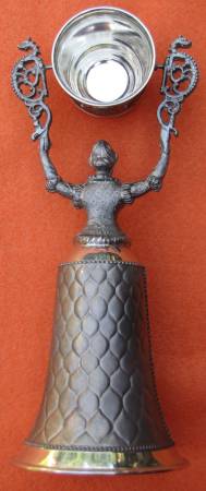 This Wedding Cup is made by Gnadental Zinn of Germany. Gnadental Zinn is a highly respected German Pewter Manufacturer. The style oof this cup is the Nuremburg Wedding Cup. The cup is turned upside down and the Groom drinks from the big cup while the Bride drinks from the small cup. This cup is highly detailed, solid Pewter and the interior of the cup is silver plated. This is New Old Stock.