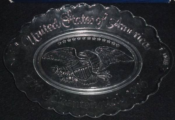 American Bicentennial Dish with Soaps Mint condition glass plate featuring the American Bald Eagle and shield, with two Avon soaps in original packaging. We also have other Bi-Centennial items...