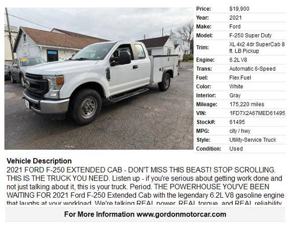 2021 FORD F-250 EXTENDED CAB - DON'T MISS THIS BEAST! STOP SCROLLING. THIS IS THE TRUCK YOU NEED. Listen up - if you're serious about getting work done and not just talking about it, this is your truck. Period. THE POWERHOUSE YOU'VE BEEN WAITING FOR 2021 Ford F-250 Extended Cab with the legendary 6.2L V8 gasoline engine that laughs at your workload. We're talking REAL power, REAL torque, and REAL reliability. No diesel headaches, no DEF fluid nonsense - just pure American muscle that fires up every single time. BUILT FOR BUSINESS This isn't some pavement princess. This F-250 comes equipped with an 8-foot bed open utility body ready to haul whatever you throw at it. Contractors, landscapers, fleet managers - this truck was purpose-built for people who actually WORK for a living. METICULOUSLY MAINTAINED - ONE OWNER Here's what separates this from every other used truck out there: ONE OWNER - No mystery history, no auction nightmares ALWAYS serviced on time - Every single maintenance interval, no exceptions Looks and runs great - This truck has been CARED for, not abused THE BOTTOM LINE While everyone else is out there buying overpriced trucks with questionable histories, YOU have the chance to grab a meticulously maintained workhorse that's ready to make you money starting DAY ONE. This F-250 won't last. Trucks like this - with verified maintenance records and clean ownership - get snatched up FAST by people who know quality when they see it. DON'T WAIT. SERIOUS INQUIRIES ONLY. Call now before someone smarter beats you to it. This is a work truck for workers. If you need something to pose with at the mall, keep scrolling.