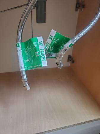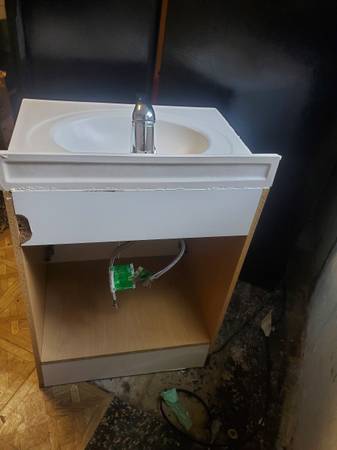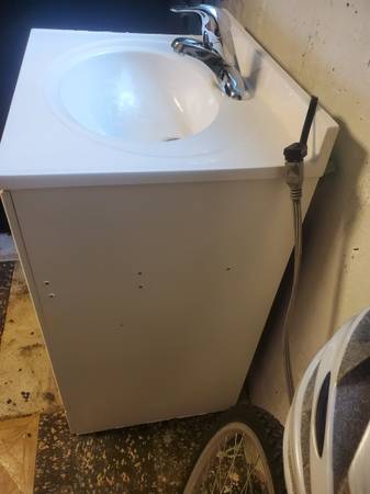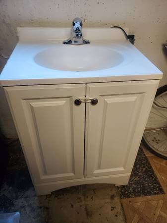 Bathroom vanity with sink and Moen brand faucet, and water supply line connectors - 4 years old, but in very good condition - left after a renovation - size 24.5 w x 18.5 D x 35.25 H (high measured by back - behind the faucet) - located in North East Philadelphia- $100.