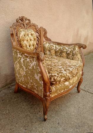 Antique bergere/ cabriole style armchair in good condition. Carved wood back, arms and front legs.