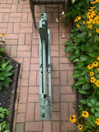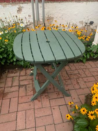 Folding plastic Patio Table with umbrella hole 29 in tall top is 29 1/2 x 28 folds for easy storage