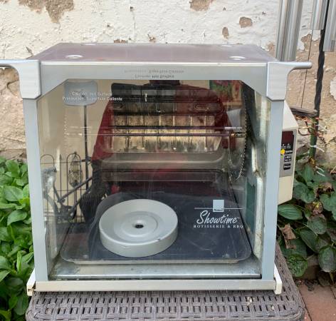 Ronco Showtime Platinum digital Edition Rotisserie Oven. Make perfectly roasted chickens, turkey, pork, roasts, and burgers that are delicious and healthy too. Its large capacity accommodates a 12-pound turkey or 2 whole chickens while still fitting on your countertop! The three cooking options allow you to Roast with normal rotisserie rotation, Sear to pause rotation and stop food in front of the heating element, and No Heat Rotation to keep juices evenly distributed before serving. An adjustable timer will automatically shut-off when cooking time is up which means no more worrying about overcooked food. The Ronco rotisserie ovens feature dishwasher safe parts for easy clean up.