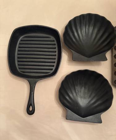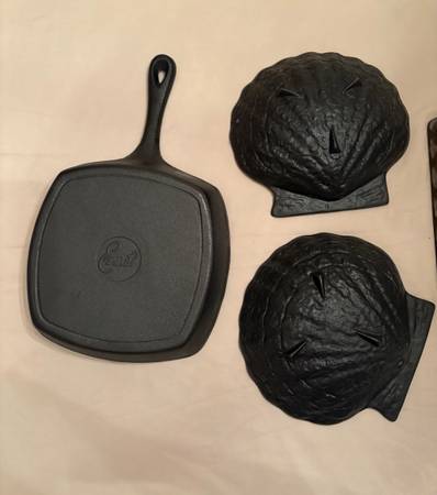 Pictures in order. $125 for all 7 pieces. $35. New Emeril Lagasse Pre-Seasoned 10" Cast Iron Square Skillet Grill Pan. $30 each. New and Vintage Black Cast Iron 9.5” Clam Shell bake pan or skillet....