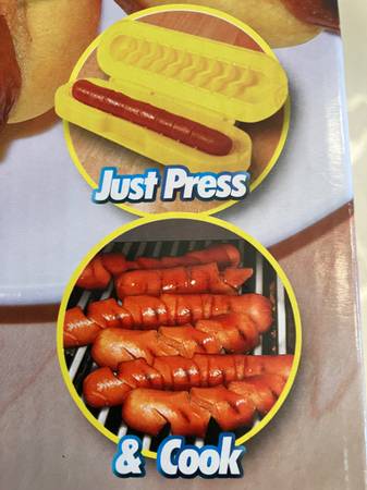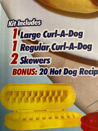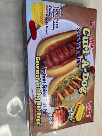 Curl-A-Dog is the safe easy way to make spiral cut hot dogs in seconds. The curls create flavor pockets that hold condiments for more flavor in every bite. The curly edges for more grilled flavor.works perfect for grilling or boiling. Dishwasher safe. Brand new.