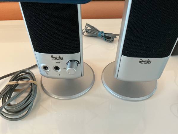 HERCULES SPEAKERS, Like new condition. On-off switch with volume control. Plug ins for headphones & microphone. Removeable base. Measurements- with base -10.5 ( height), 2.5 (width). Without base- 8.5 ( height ), 2.5 (width ). Color-silver-gray. Speaker material color - black. $15.00
