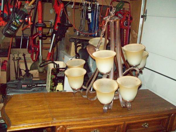 HERE IS A GREAT EIGHT LIGHT METAL WOOD APPEARING CHANDELIER. THANKS