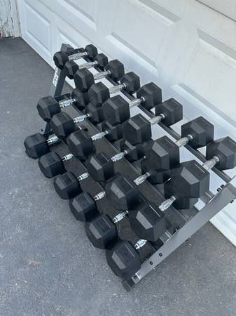 New- never used, new in box Price is firm 5-50lb rubber hex dumbbell weights in 5lb increments Rack is 3ft tall, 4ft wide, 2ft deep Sets of 5, 10, 15, 20, 25, 30, 35, 40, 45, 50 550lbs total in...
