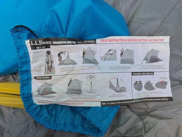 L.L. Bean Sunbuster folding shelter. Includes all original items: shelter, stakes, and carrying bag. Instructions for assembly are attached to carrying bag; instructions for disasembly are printed directly on shelter. Can be assembled and disassembled in only minutes... very innovative system. Shelter used once. Like brand new.