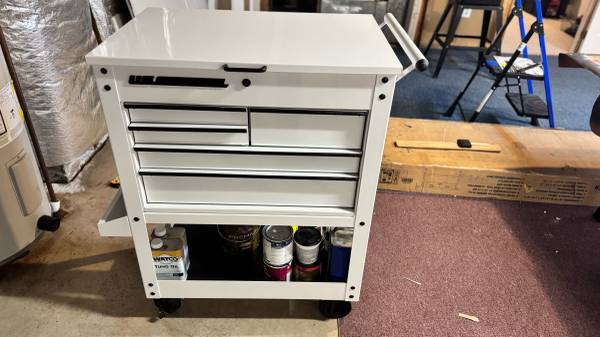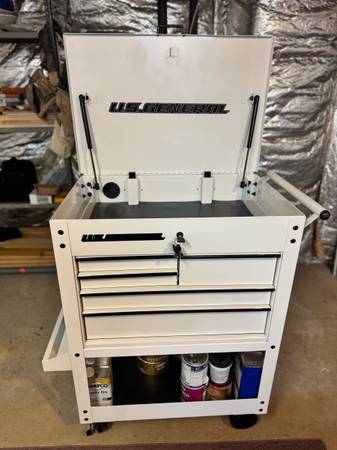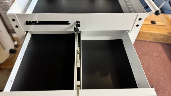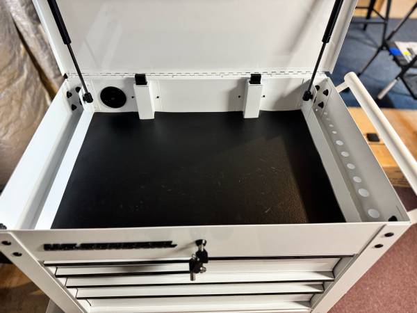 The U.S. GENERAL® Mechanics Cart is equipped with a 5-drawer setup optimized for tool storage. The cart has 15,000 cu. in. of total overall storage, 6900 cu. in. of lockable storage, and a 700 lb. load capacity. With rolled drawer edges, full-width drawer latches, precut nonslip drawer liners, a side can-holder, and an integrated power port, this mechanics cart is loaded with the features you need, including an integrated barrel lock to secure all the drawers. Durable full-extension ball-bearing slides and a tough powder-coated finish mean this cart is up to the task at hand whether it's in the local automotive shop or in your own garage. The U.S. GENERAL® cart line is designed internally by our Harbor Freight engineering team to precise industry-leading standards, and every specification and feature is rigorously tested in our state-of-the-art testing facility in the USA. The combination of quality materials, precise standards, and rigorous testing provides you with peace of mind knowing this cart is high quality and is resilient for a long service life.