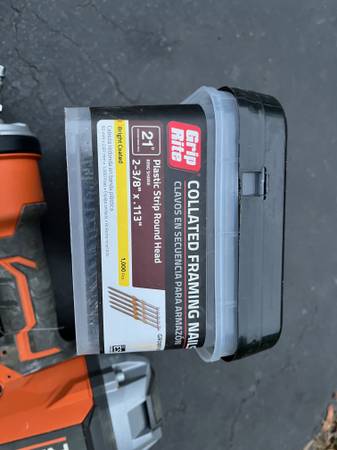 Very low use Ridgid roundhead framing nailer, model R350RHF3 works as new. Includes 2 boxes (one unused, the other partially filled) of 2 3/8 plastic strip round head nails - about 1500 nails total.