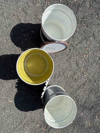 Update: the two with lids sold for $20, the remaining drum painted grey with no lid is $10