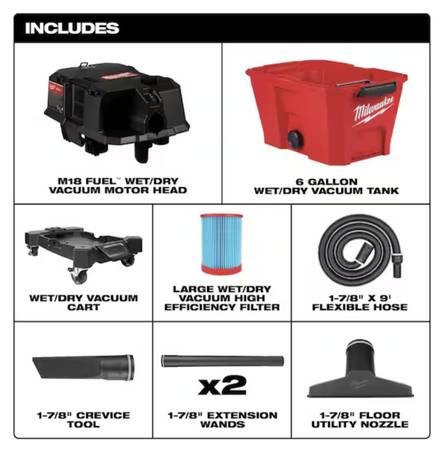 Milwaukee M18 FUEL Wet/Dry Vac (6gal) w/ Cart, Hose (9') & Accessories (NEVER USED) A powerful and versatile setup for a variety of trades, auto cleaning or a homeowner. An all-in-one vacuum...